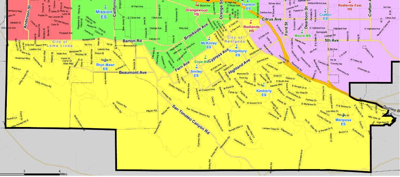 South Redlands - south of Terracina Blvd, south of Fern Ave to Redlands Blvd, and south of the I-10 freeway on the eastern side of the district