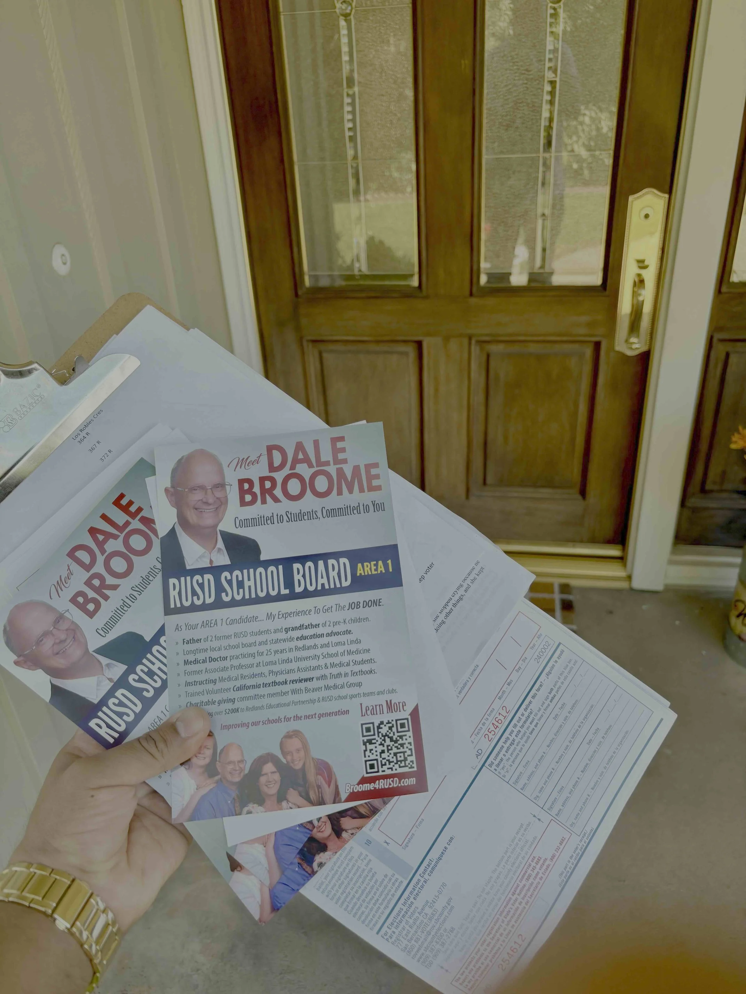 We had 29 volunteers canvass 630 homes in South Redlands and South Loma Linda handing out Broome4RUSD campaign flyer and a candidate comparison flyer.